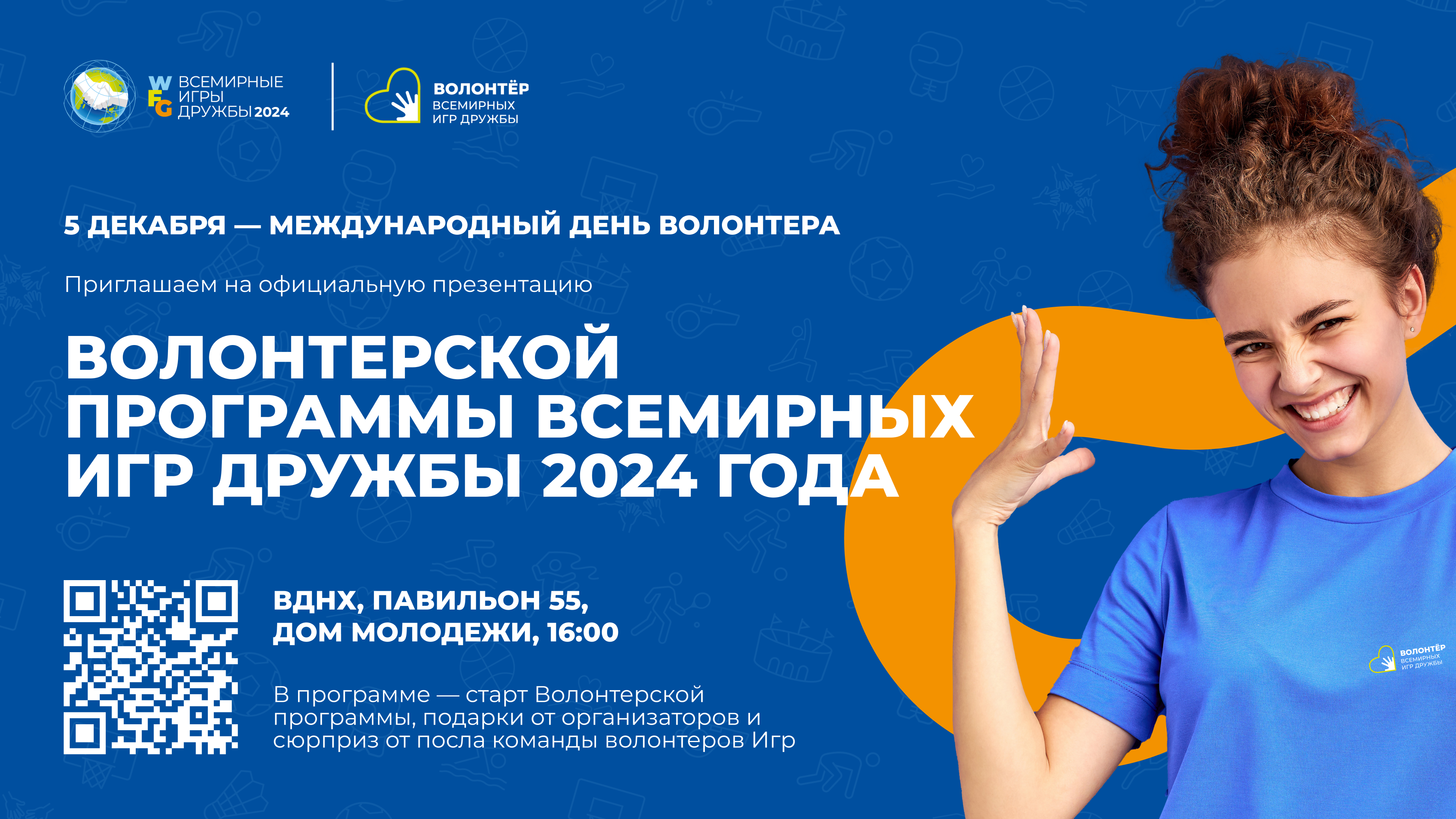 5 декабря, главный зал 55 павильона ВДНХ («Дом молодежи») — официальный запуск Волонтерской программы Всемирных Игры Дружбы-2024. Волонтерская эстафета, лекции руководителей крупнейших спортивных событий, запуск предварительной регистрации кандидатов в волонтеры, торжественная церемония подписания соглашений, презентация посла волонтерской программы Игр, подарки.